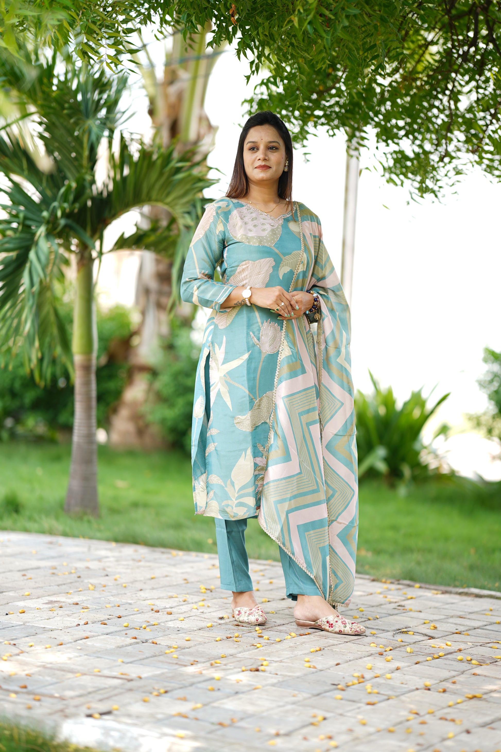 Women Embroidered Floral Printed i Style Kurta with Trouser & Dupatta