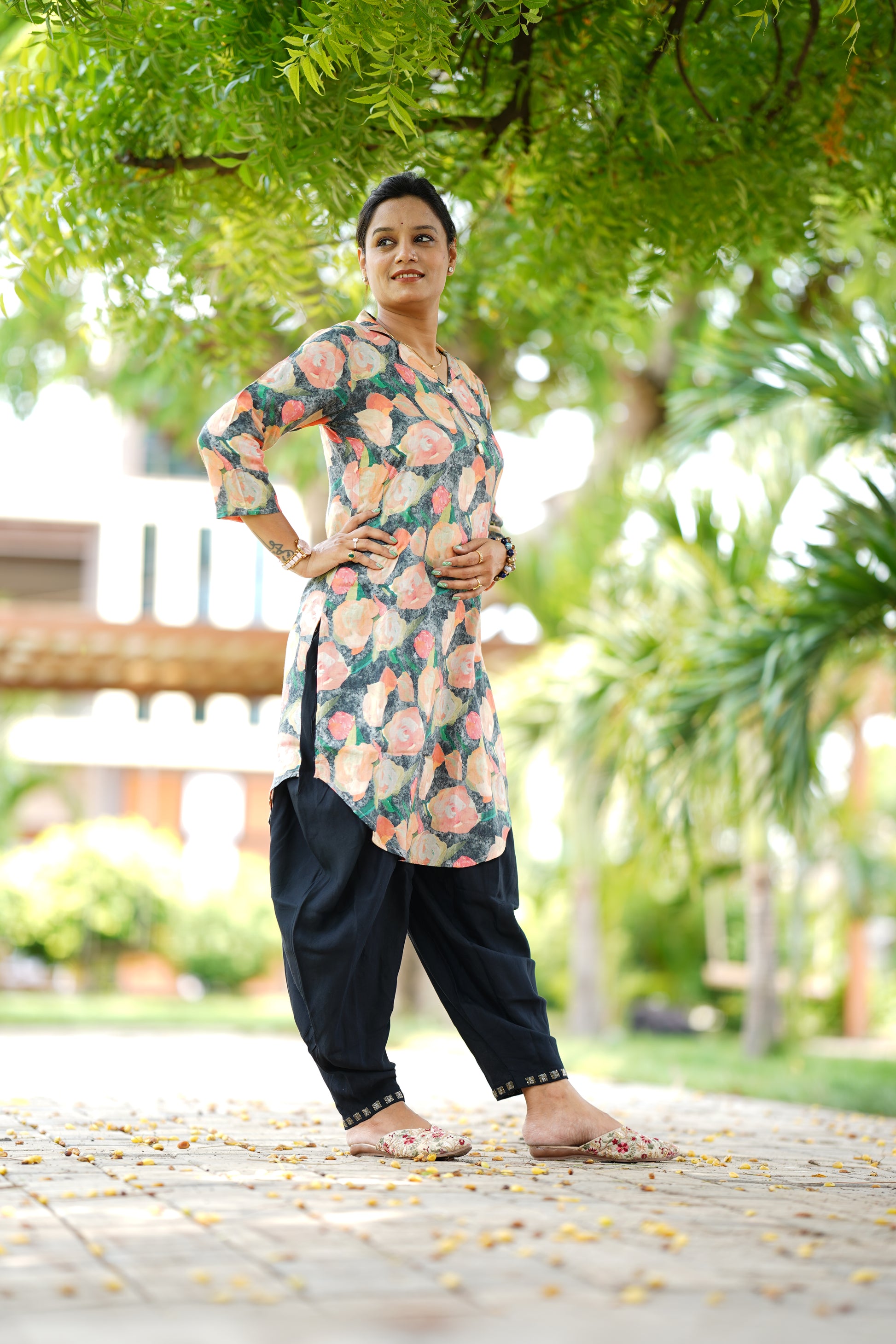 Black Floral Printed V-Neck Thread Work Pure Cotton Straight Kurta